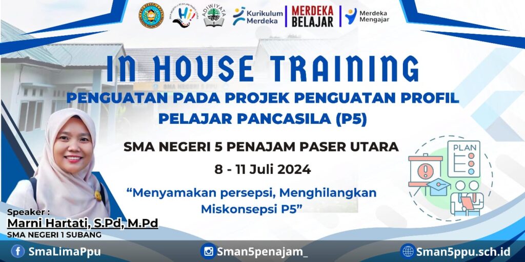 SMA Negeri 5 Penajam Paser Utara menyelenggarakan kegiatan In House Training dengan tema “Penguatan pada Proyek Penguatan Profil Pelajar Pancasila (P5)”. Kegiatan berlangsung selama empat hari yang dimulai tanggal 8 hingga 11 Juli 2024. Dengan tujuan memperkuat pemahaman dan persepsi para pendidik mengenai implementasi P5 dalam kurikulum Merdeka Belajar.